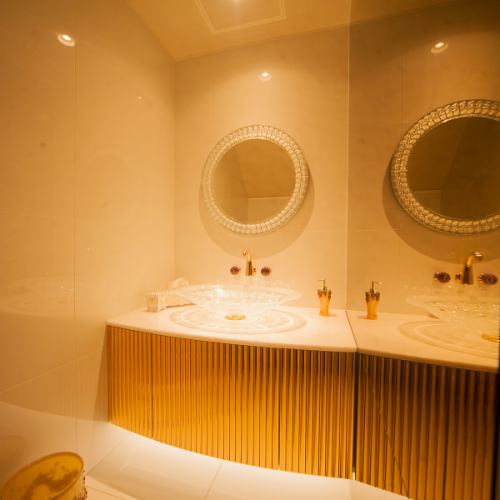 【日本初】パウダールームには、クリスタルガラスに豪華に彫刻された宝石のような洗面ボウルとミラーが。 花の形をした蛇口に、ノブはアメジストが使われています。壁と床面にはチャペルでも使用する特殊なガラスコーティングされたタイルを使用しています。 右側の壁面にはブロンズミラーが貼られています。